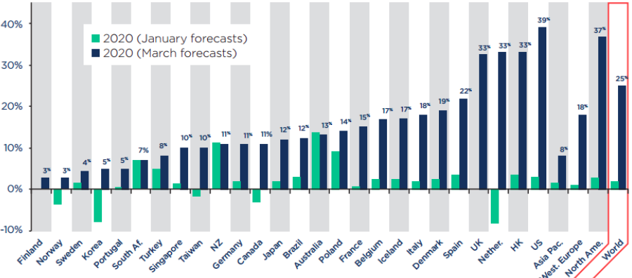 基于疫情将在上半年消退的假设,今年全球企业破产增长率将显著提升,预计2020年全球企业破产数将同比上涨25%,而2019年全年以及今年1月份该预测增长率均仅为2%。