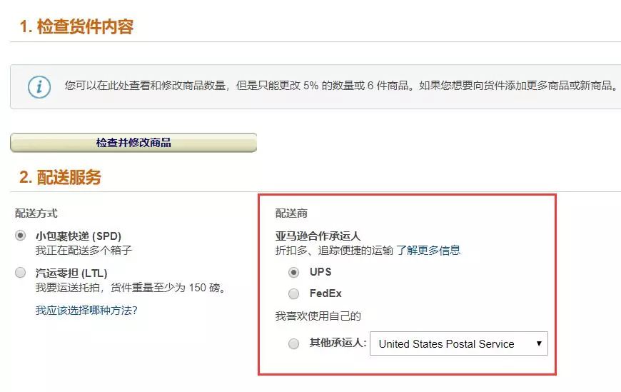 第二步,选择具体的发货渠道,比较常用的有UPS和FedEx(这里选择哪个渠道,也要提前和海外仓确认,不是每种渠道都支持)。
