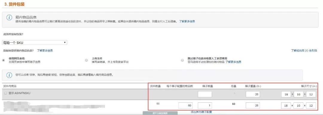 第三步,根据海外仓提供的装箱数据,填写对应的重量、尺寸等信息。
