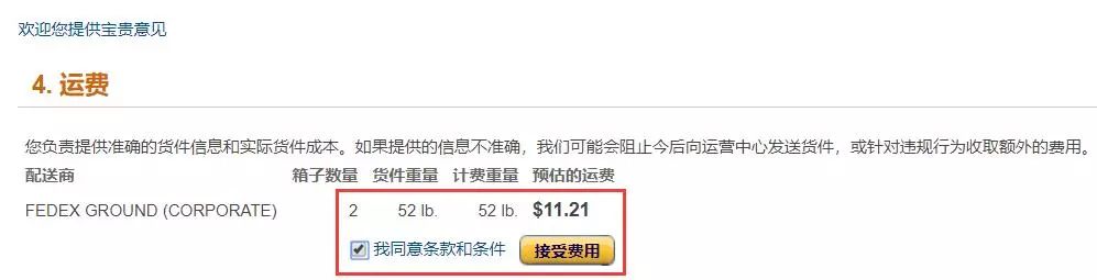 第四步,上面的信息填写完成之后,系统会根据重量来预估运费。如果觉得OK的话就可以点击【接受费用】。
