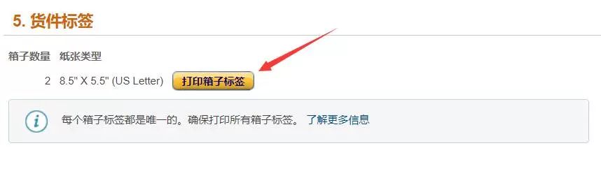 第五步,点击【打印箱子标签】,这里会同时生成FBA箱唛和物流渠道的发货标签,两个标签都需要给到海外仓并贴到箱子上才能正常发货。