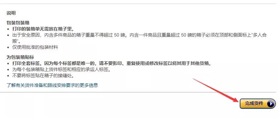 第六步,确认好前面的信息准确无误,最后点击【完成货件】即可。